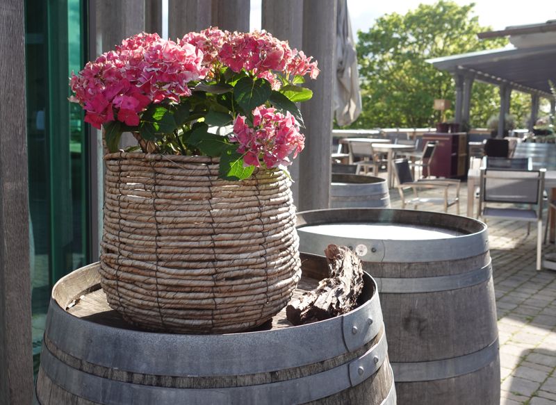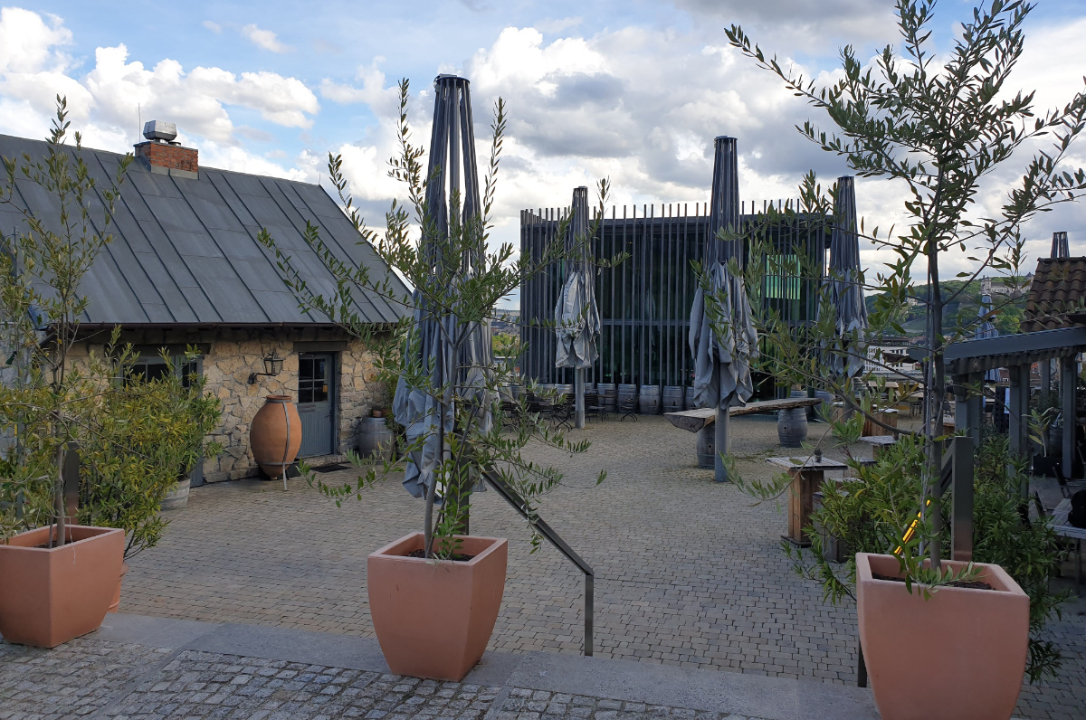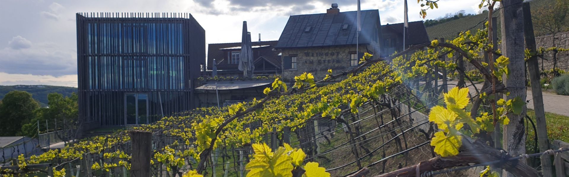 Meinen ersten Halt mache ich in Würzburg, im Weingut am Stein. Ich folge der Ausschilderung und biege steil rechts von der Hauptstraße ab. Jetzt ist es nur noch ein kurzes Stück, bis ich an einem historischen Winzerhäuschen vorbei auf einem Plateau unterhalb der Weinberge angekommen bin. Ich stehe vor einem etwa 10 x 10 Meter großen, mit Eichenpfählen verkleideten gläsernen Kubus. Mir gefällt, wie die moderne Formsprache der Architektur mit dem Weinbau korrespondiert.