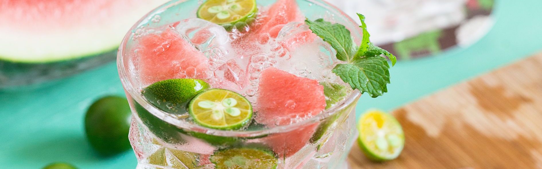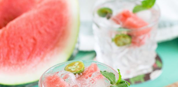 Aus welchen Zutaten ließe sich ein erfrischender Drink herstellen? Ganz einfach: Kleine Stückchen aus der Wassermelone in ein hohes Glas geben. Das sanft süß schmeckende Fruchtfleisch ist ein fantastisches Gegenüber zum gut gekühlten Gerolsteiner Feinperlig.